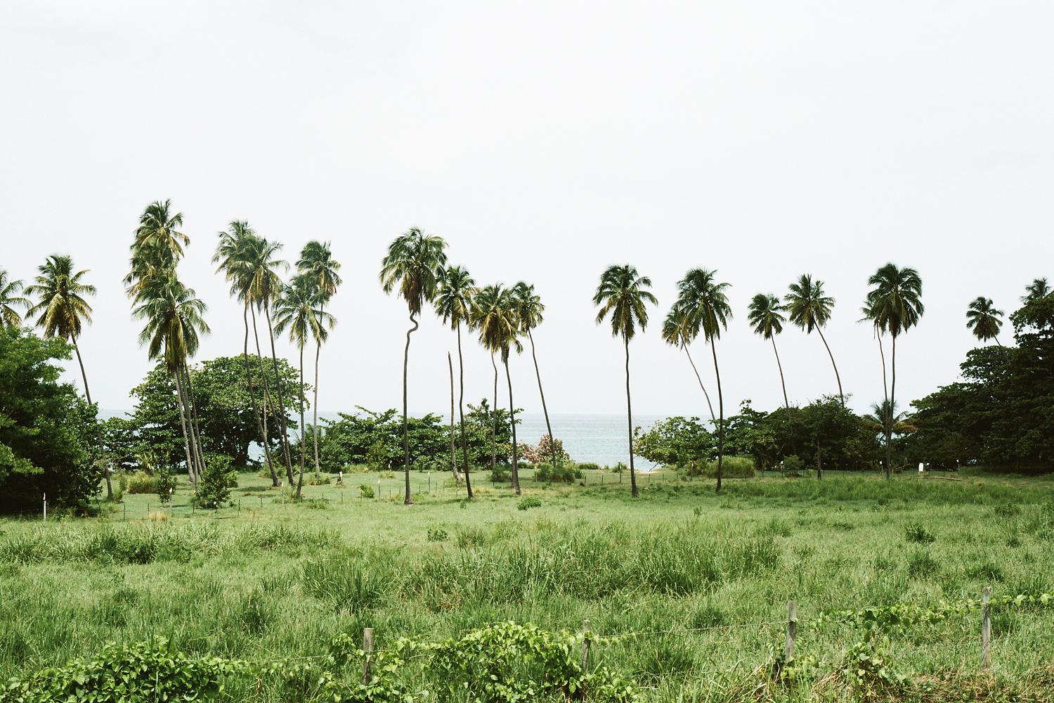 Taken along the coast on the island of Rincon, Puerto Rico on 35mm film. This view is the happiest view in Rincon with the vast open pasture, swaying palm branches, cows, and the iconic squiggle palm tree. You know you're in Rincon when you see this view.